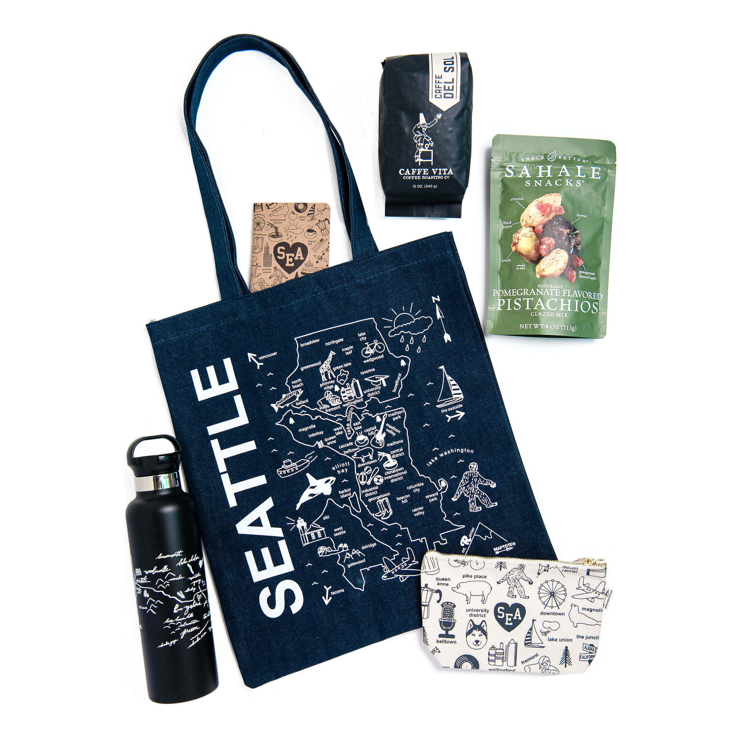 Welcome to Seattle! This Denim Tote is filled with Seattle inspired keepsakes and treats to enjoy!